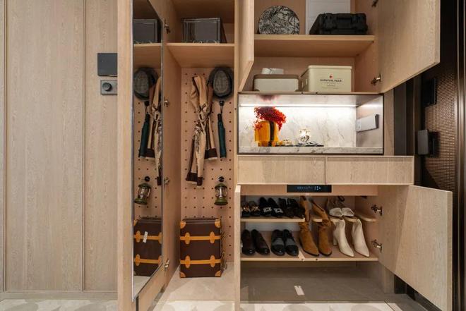 玄关收纳更精细,每个格子的规划都很贴近生活,随手物件,女主人的高靴,吸尘器、扫地机器人、行李箱等都有各自安置空间。