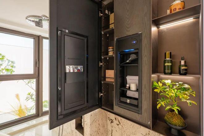 眼前一亮的是卫生间收纳,项目的镜柜是内外双镜,并且内部的收纳空间相当丰富,小到女主人的发箍、面膜、口红、香水,大到吹风机都有适合的位置。