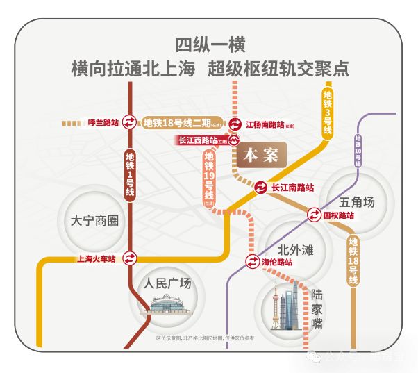 地铁18号线横向拉通了原本纵向不相连的四线,将北上海横向联通,成为区域轨交的交汇聚点;项目紧邻长江西路地铁站(直线站五角场。