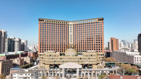 比如入口处精选北京钓鱼台国宾馆同款的水墨玉天然石材,运用于通高大门、迎宾楼背景墙等处,品质感尽显。
