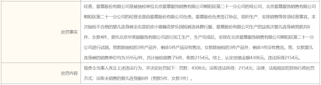1月10日,北京市朝阳区人民政府官网显示,爱慕股份有限公司(以下简称“爱慕”)因旗下一款婴儿连身裤抽检不合格被罚款4308元。